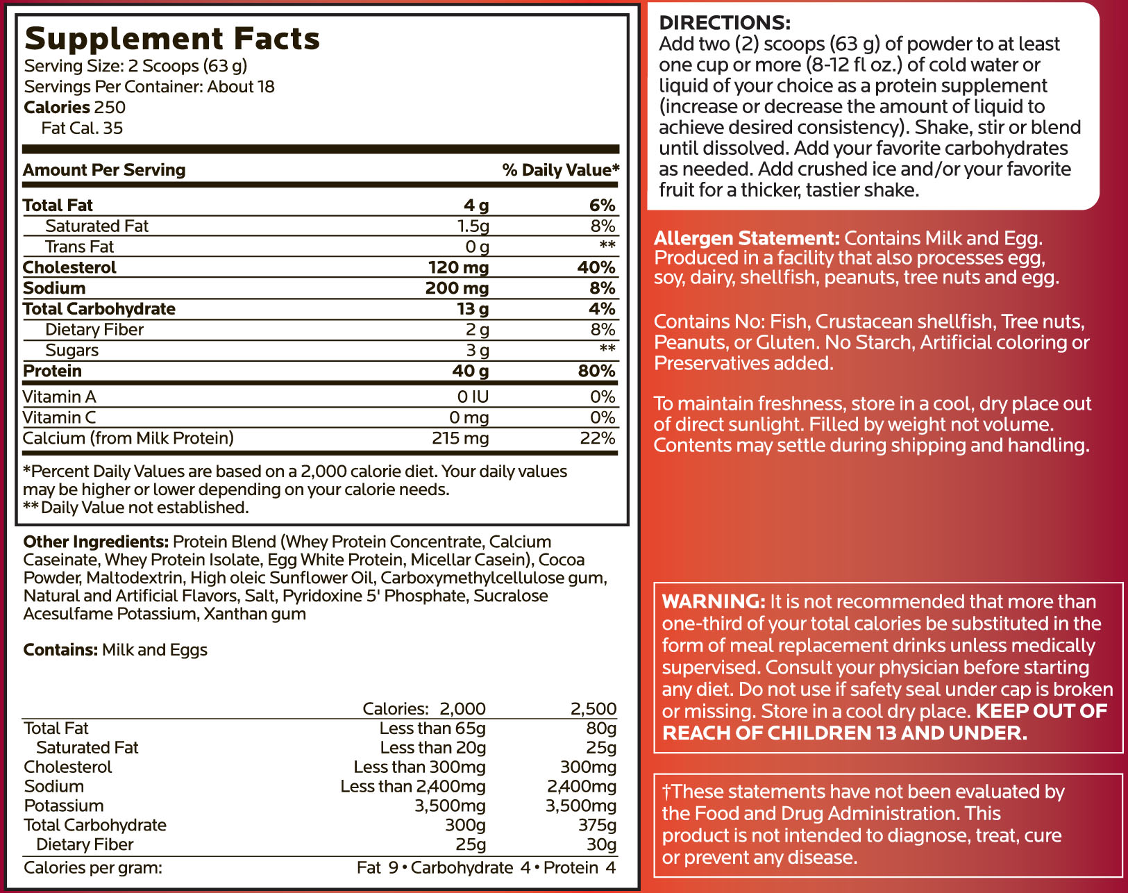 • Add two scoops of powder to one cup (8-10 fl oz.) of cold water or liquid of your choice (increase or decrease the amount of liquid to achieve desired consistency). Shake, stir or blend until dissolved. Add your favorite carbohydrates as needed. Add crushed ice and/or your favorite fruit for a thicker, tastier shake.