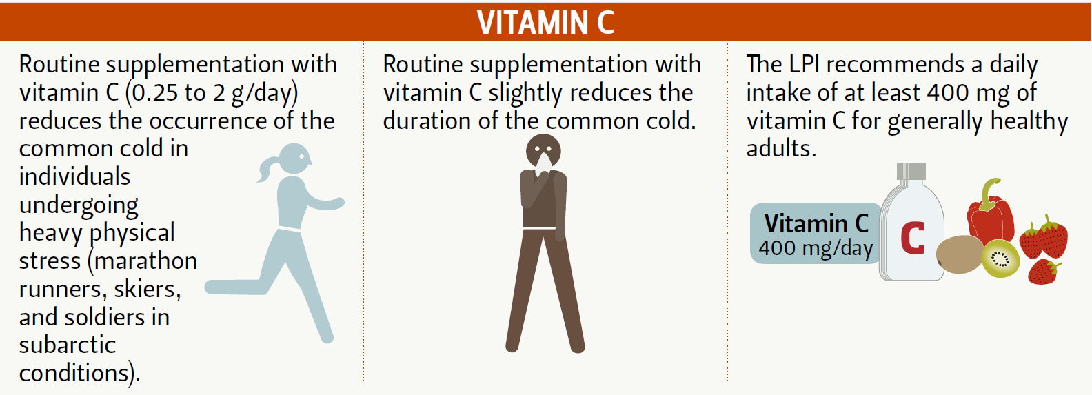 The strongest evidence for vitamin C is in 1) reducing the duration of the common cold and 2) reducing the occurrence of a common cold in athletes when taken regularly as a preventative aid as opposed to what many people do, which is take high doses after they get sick.